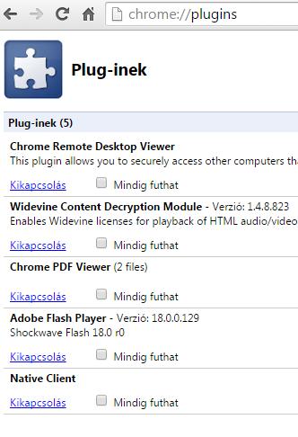 - Külső kiegészítők tiltása - Igazság szerint én gyakorlatilag majdnem minden kiegészítőt tiltottam. A HTML5-ben fut már a Youtube is, szóval a Flash tényleg minimálisan indokolt. A Java szintén ilyen kiegészítő. Bár jelenleg sok cég használ java alapú online szoftvert amihez kell, de erre azt tudom javasolni, amíg használjuk kapcsoljuk vissza, vagy használjunk egy böngészőt csak a Flash, és Java tartalmú oldalakra. Böngészéshez nem valószínű, hogy kelleni fog. Letiltásuk: Címsorba be kell írni - chrome://plugins/