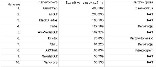 A tíz legaktívabb kártevőcsaládból egyébként öt trójai (Remote Acces Trojan – RAT). Az ilyen kártevőket a bűnözők arra használják, hogy távolról ellenőrizzék és irányítsák a megfertőzött gépeket, így ellophatják a jelszavakat, hozzáférhetnek a bizalmas adatokhoz, vagy akár titkosíthatják a merevlemez tartalmát. Mellettük a Tinba és a Shifu banki trójaiak is aktívak, ezek a böngészőkbe épülve próbálják meg kiolvasni az internetbankokhoz tartozó adatokat és a hitelkártyaszámokat.